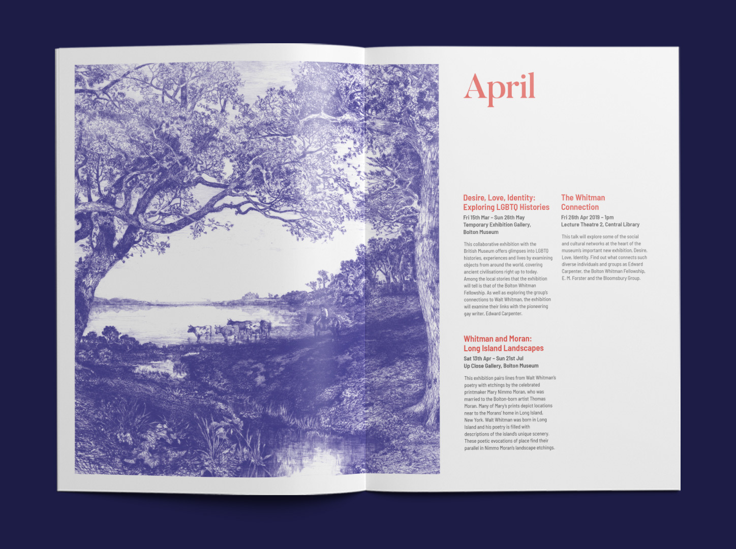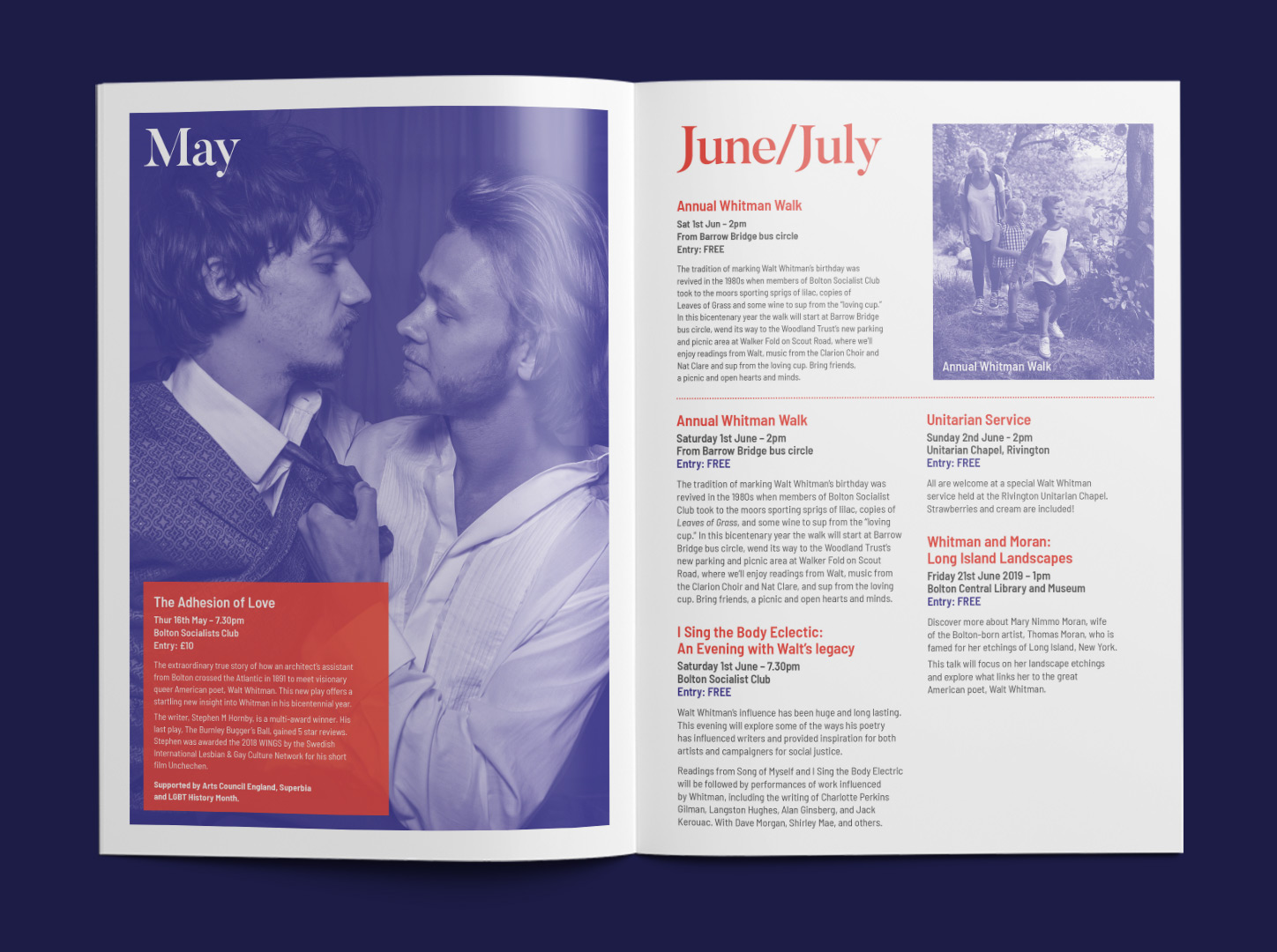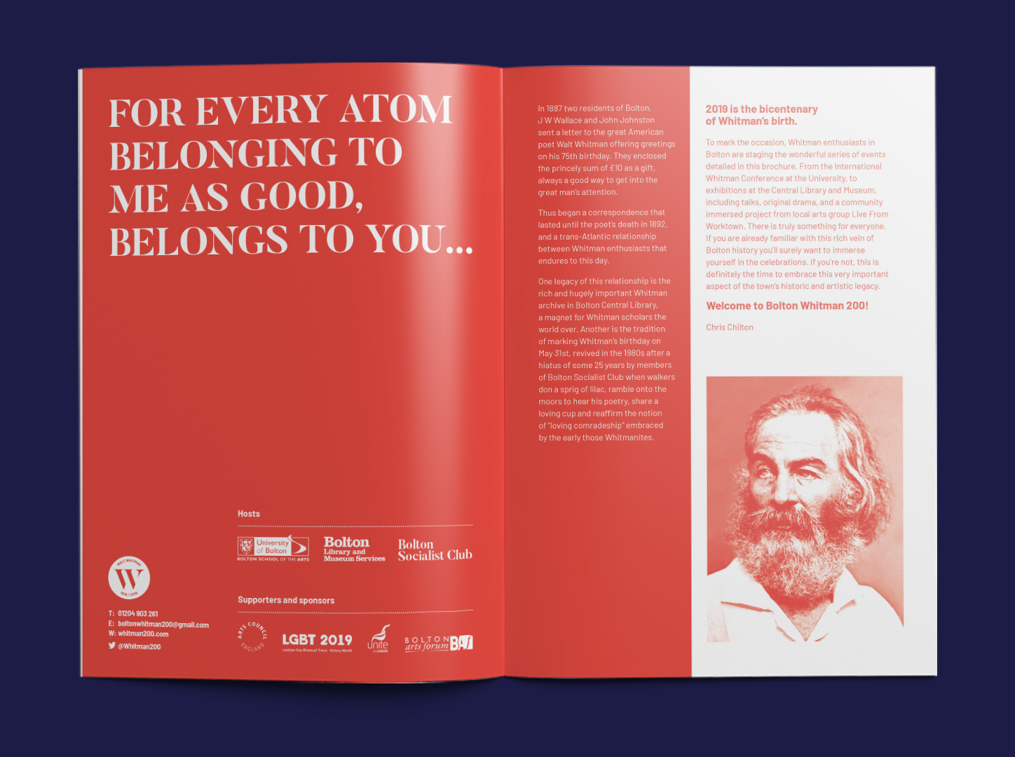 Using elements from the main Bolton English brand kit, create a festival identity to celebrate the 200th anniversary of Walt Whitman’s birth. With Whitman’s strong links to Bolton and a world-wide audience, the festival will contain a multi-phase international conference involving both local heritage and community groups, the university and international academia.
